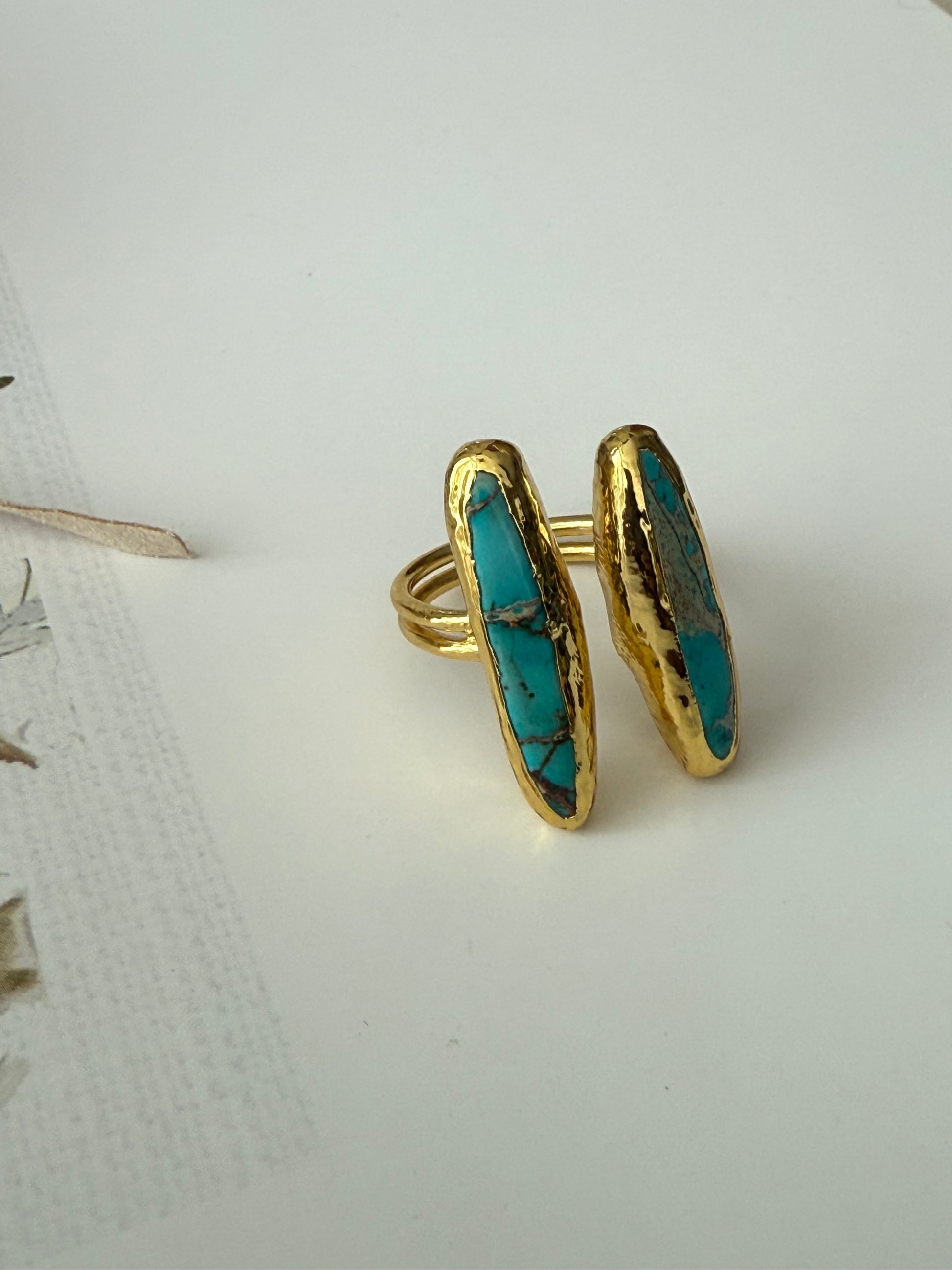 An effortless statement of elegance, this handcrafted open ring from Kaamra Jewels features a radiant natural turquoise stone, celebrated for its serene hue and timeless allure. Wrapped in a rich 18K gold plating, the design exudes refined luxury with a touch of organic beauty.