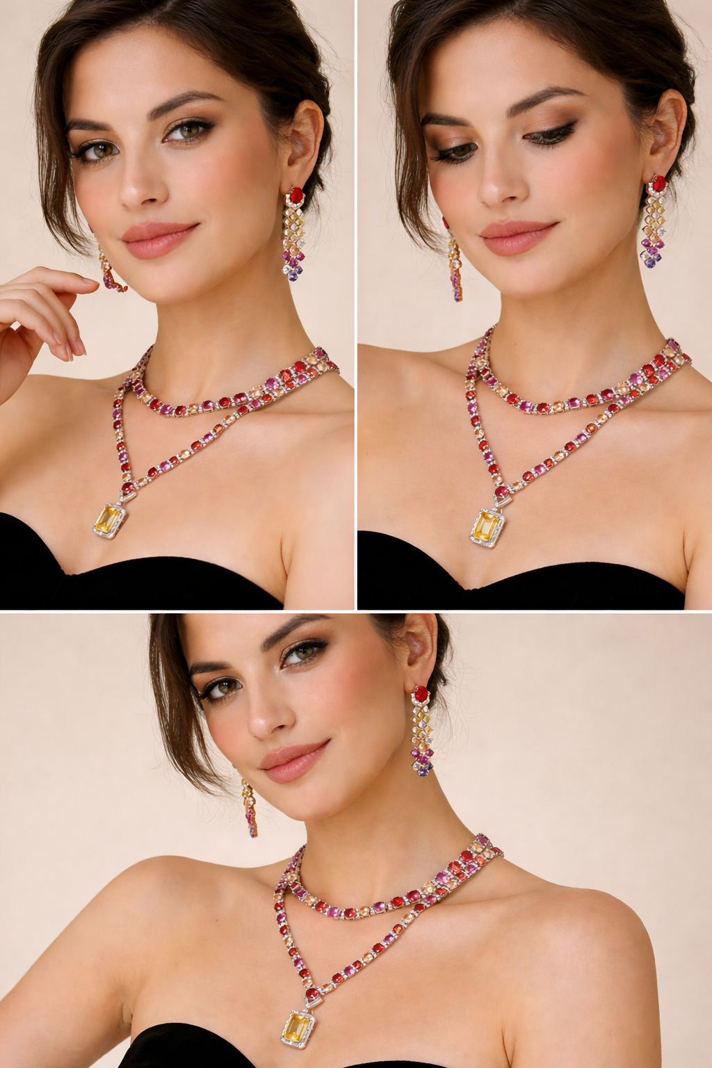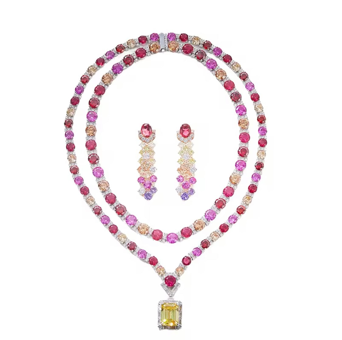 Inspired by the glowing skies over Venice as the sun melts into the horizon, the Venetian Sunset Necklace Set captures the warmth, romance, and brilliance of an Italian evening. This breathtaking design features a cascade of radiant ruby and blush-toned stones that shimmer beautifully against an elegant gold setting.